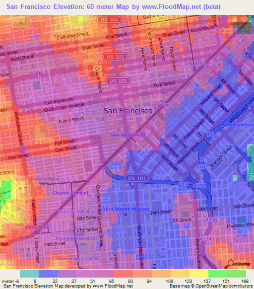 The elevation map of San FranciscoUS is generated using elevation data from NASAs 90m resolution SRTM data. This tool allows you to look up elevation data by searching address or clicking on a live google map. 9 meters 2953 feet 27.